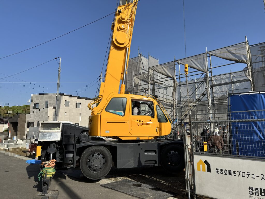 大勢の大工さんと、レッカー(クレーン車)が一堂に会し、